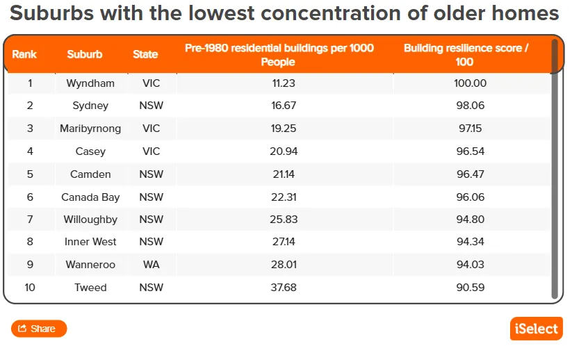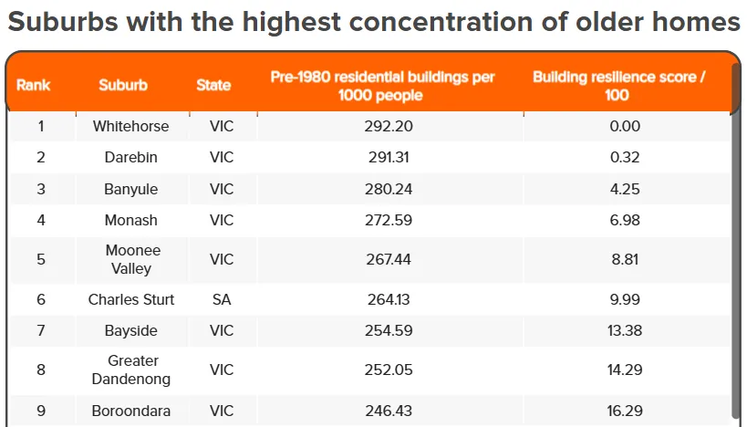 Wyndham 区 1980 年前建造的老房子比例极低,每千人只有 11 套;而 Whitehorse 却高达每千人 292 套,建筑韧性评分直接为零。