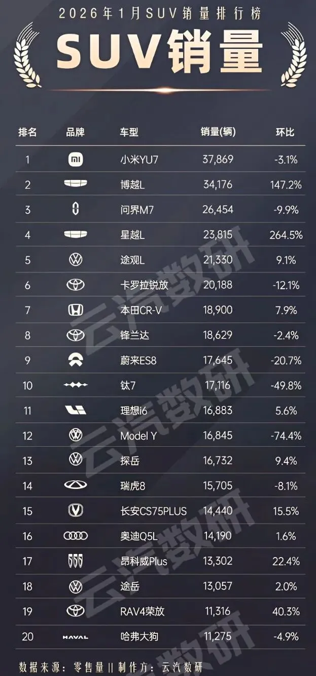 >2026年1月SUV销量排行榜