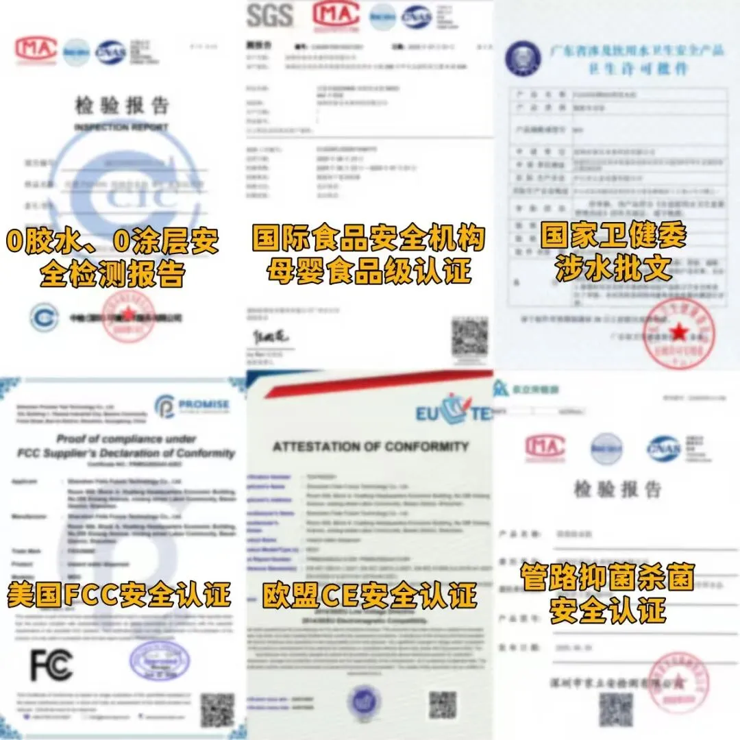 所有核心水接触部件均经过五倍以上抗腐蚀与耐高温强化处理,具备99%抗菌抑菌能力,实现全程无尘无害。同时解决用半年后安全无毒与性能大幅衰减的问题,有着6年超常规无毒及性能抗衰减认证,确保长期使用下抗腐蚀、无有毒物挥发、耐高温性能稳定持久。