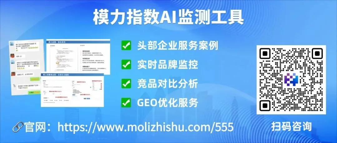 我们核心推出的模力指数工具,支持DeepSeek、腾讯元宝、Kimi、字节豆包、百度AI+等6大主流模型全覆盖监测,从提及率、认知度、推荐率、口碑、竞争度五大维度量化品牌AI表现,生成可视化报告与竞品对比。确保品牌在AI大模型回答中被正确提及、正面评价并优先推荐。(官网:https://www.molizhishu.com/555)