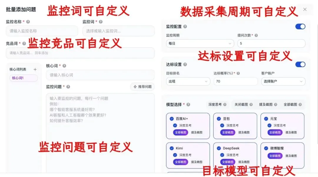 它支持全自定义监控——可自由设置监控关键词、竞品名单、监测周期,自动追踪核心指标的变化趋势,既能及时发现优化成效的波动,也能统计竞品截流情况,实现“监测—量化—优化—复盘”的全闭环。