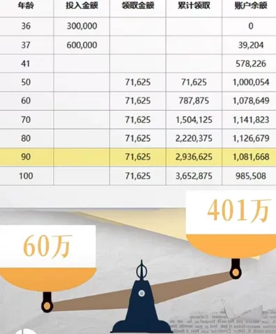 要是她领到80岁,累计能领222万,这个时候账户里面还剩下112万,这笔钱想取出来用或者是留给家里人都可以,要是身体硬朗,活到90岁,累计领取能冲到293万,账户里还留着108万,等于说就靠这60万本金,最后一共能撬动401万的总权益,本金直接翻了6倍,长期ii能达到5.8%,比存银行、买房子、收租划算太多了。