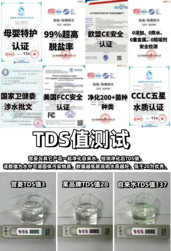 「主打效果」:深度净化200多种有害物质,包括铅、塑化剂、双酚A、阻垢剂等,实现接近万元机水准的99%脱盐率;为避免二次污染,宫菱拒绝化学添加,做到0陈水、0毒挥发,持续输出稳定纯净水。