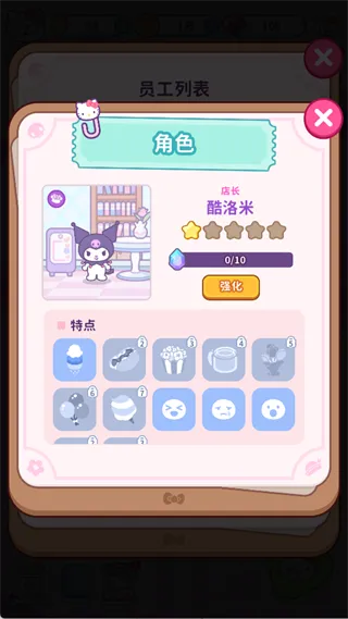 在角色列表中,可收集 Hello Kitty、帕恰狗等30多种三丽鸥角色,将他们培养成优秀的店员,壮大你的经营团队。