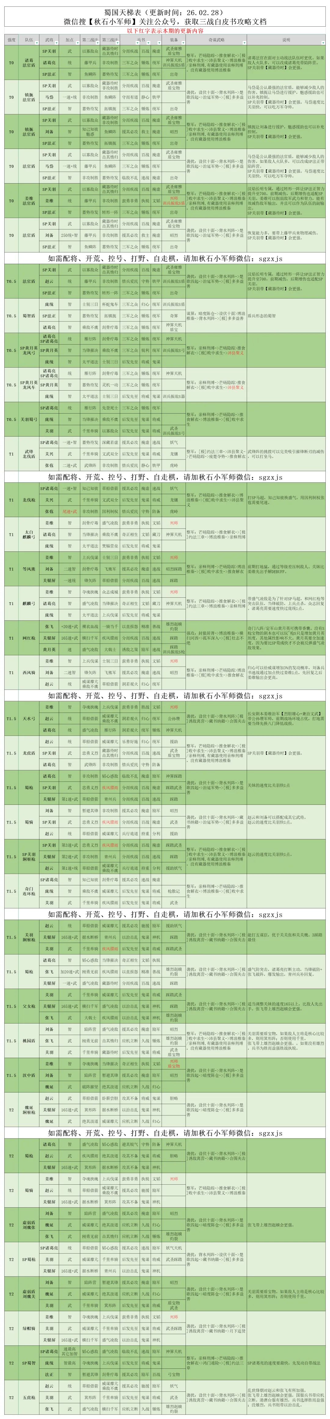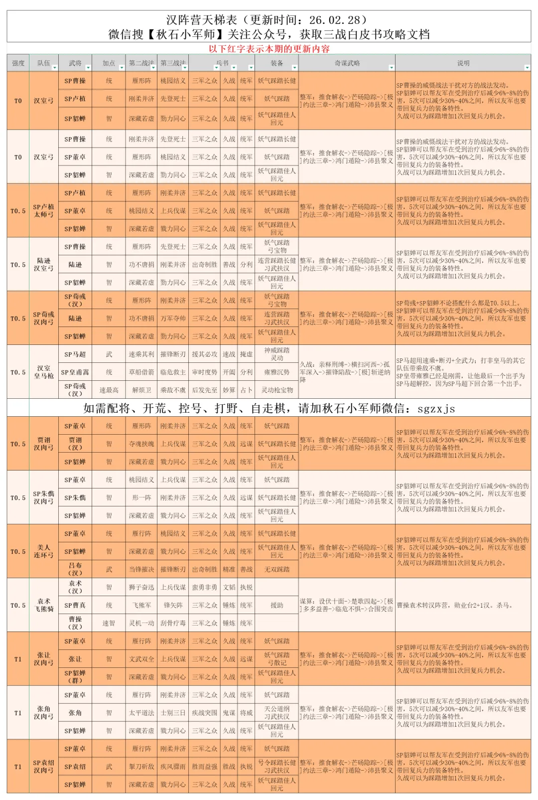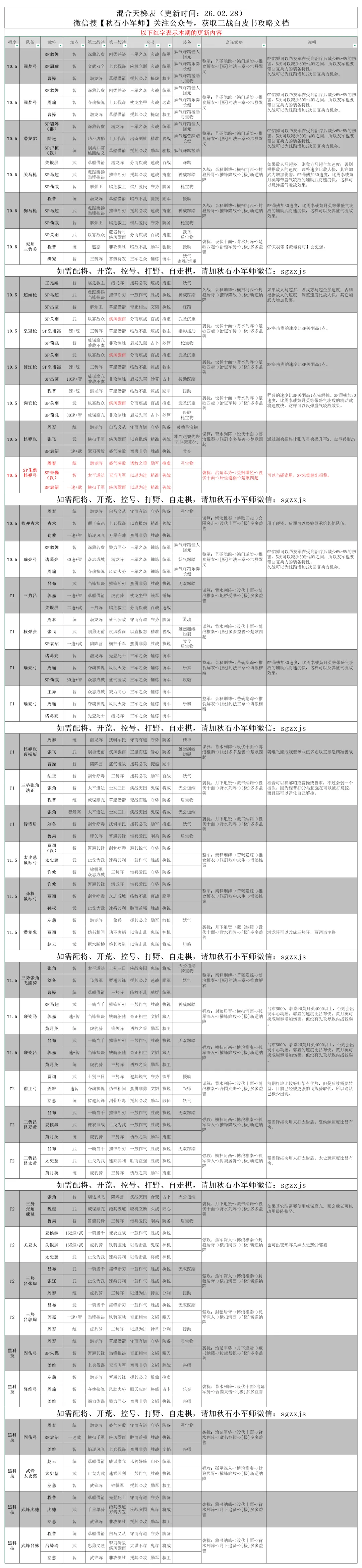 汉焰长明剧本开始已经一个多月,阵容基本固定,版本最强依旧是各大幻神,一些顶配的老队伍也能够和幻神扳扳手腕,汉阵营、汉2+1的研究还有很大的空间。在检查天梯表的时候,也发现了许多细节上的问题,例如战法的明显错误,奇谋武略的重复,都进行了修改。现在阵容强度是怎么样的呢,一起来看看吧。后续每周我都会根据实战情况进行调整更新~~