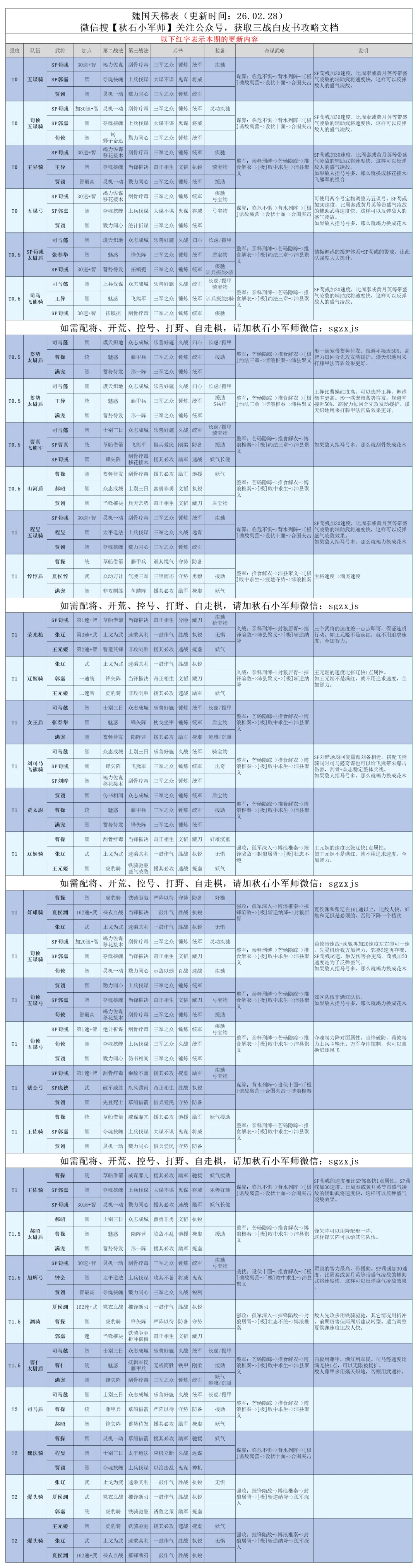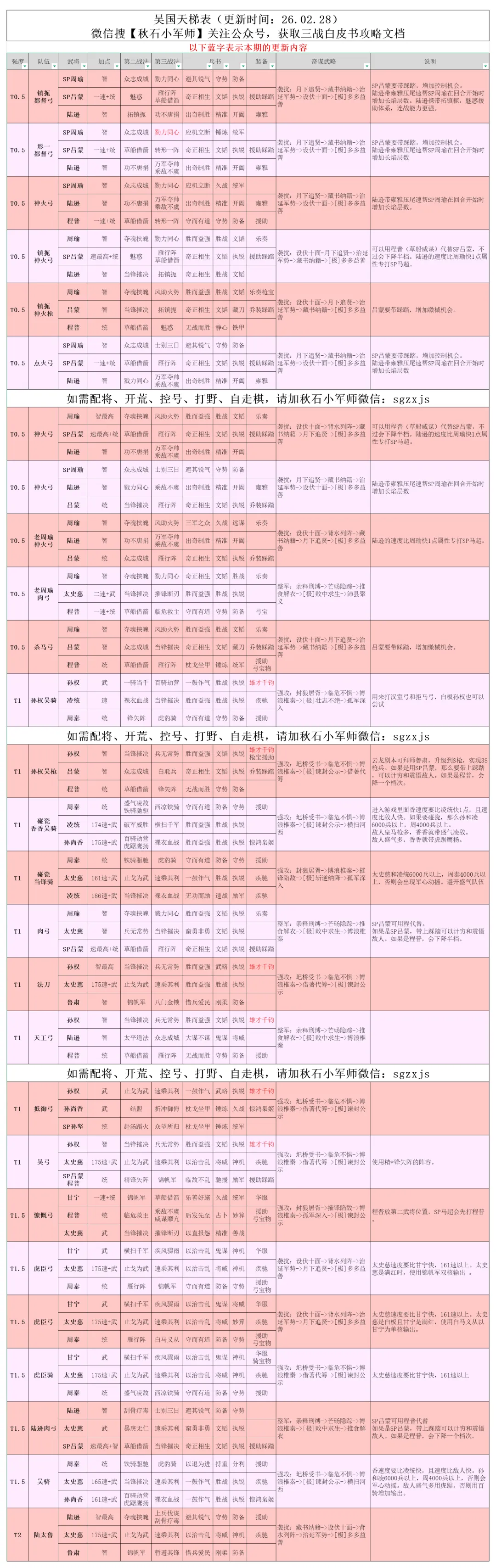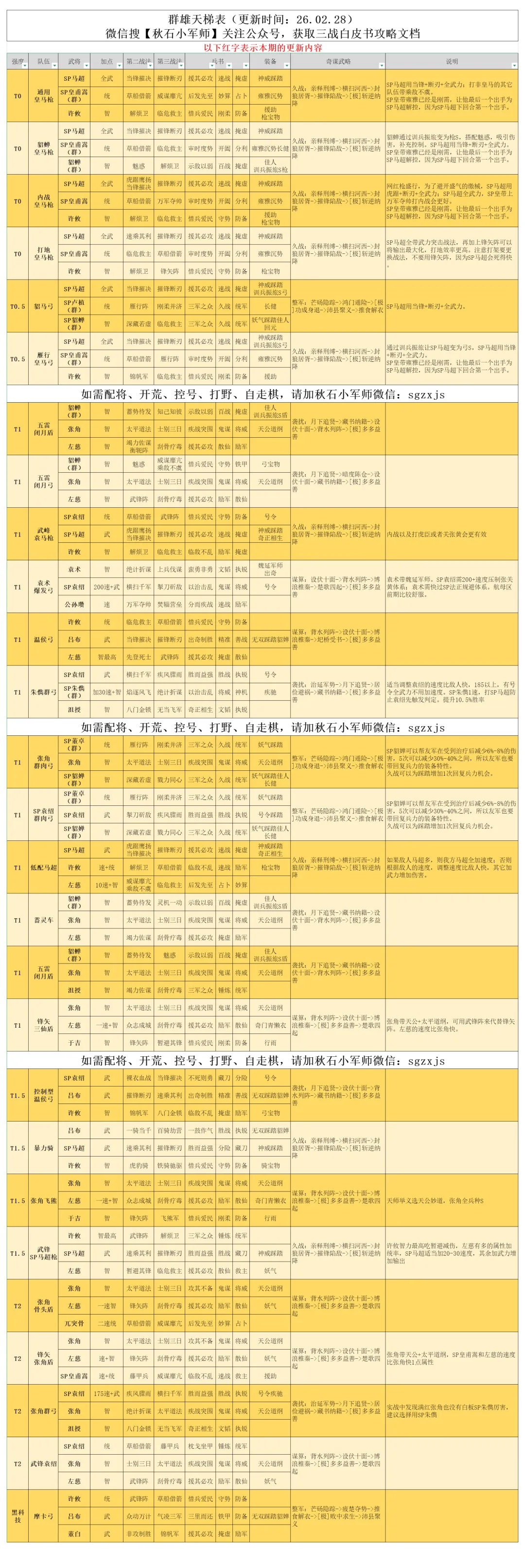 汉焰长明剧本开始已经一个多月,阵容基本固定,版本最强依旧是各大幻神,一些顶配的老队伍也能够和幻神扳扳手腕,汉阵营、汉2+1的研究还有很大的空间。在检查天梯表的时候,也发现了许多细节上的问题,例如战法的明显错误,奇谋武略的重复,都进行了修改。现在阵容强度是怎么样的呢,一起来看看吧。后续每周我都会根据实战情况进行调整更新~~
