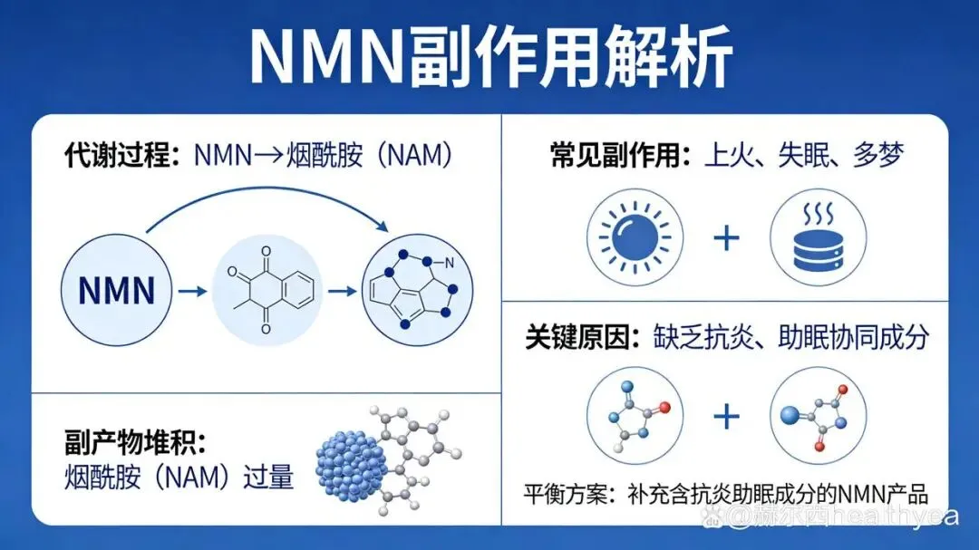 2、副作用难题:很多人出现上火、失眠、多梦,往往是因为NMN代谢产生的副产物(如烟酰胺NAM)堆积,或者缺乏抗炎、助眠的协同成分来平衡。