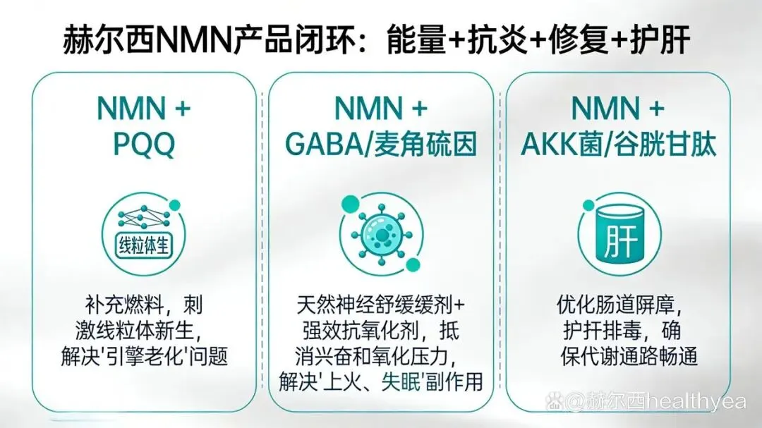 大多数品牌还在比拼NMN纯度时,赫尔西已经构建了“能量+抗炎+修复+护肝”的闭环: