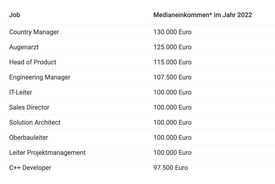 近日,德国招聘网站Indeed和评论网站Glassdoor对德国雇主提供的工资信息进行了比较。参考内容包括:所有在2022年1月1日至2022年12月31日期间在Indeed上的招聘广告中,至少75个职业的工资信息的中位数收入对比。这里中位数是指当工资数值按大小排序时,正好位于中间的数值大小。因此,中位数比平均值更准确,因为它不受个别极高或极低数值的影响。