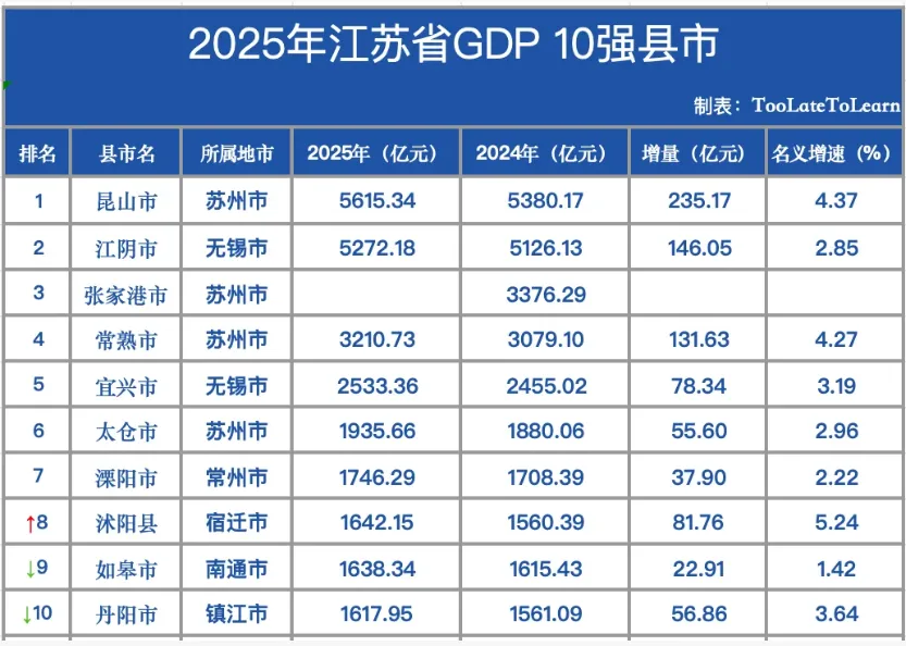 随着2025年江苏县域经济数据逐渐整理完成,江苏GDP十强县市的格局也再次浮出水面。