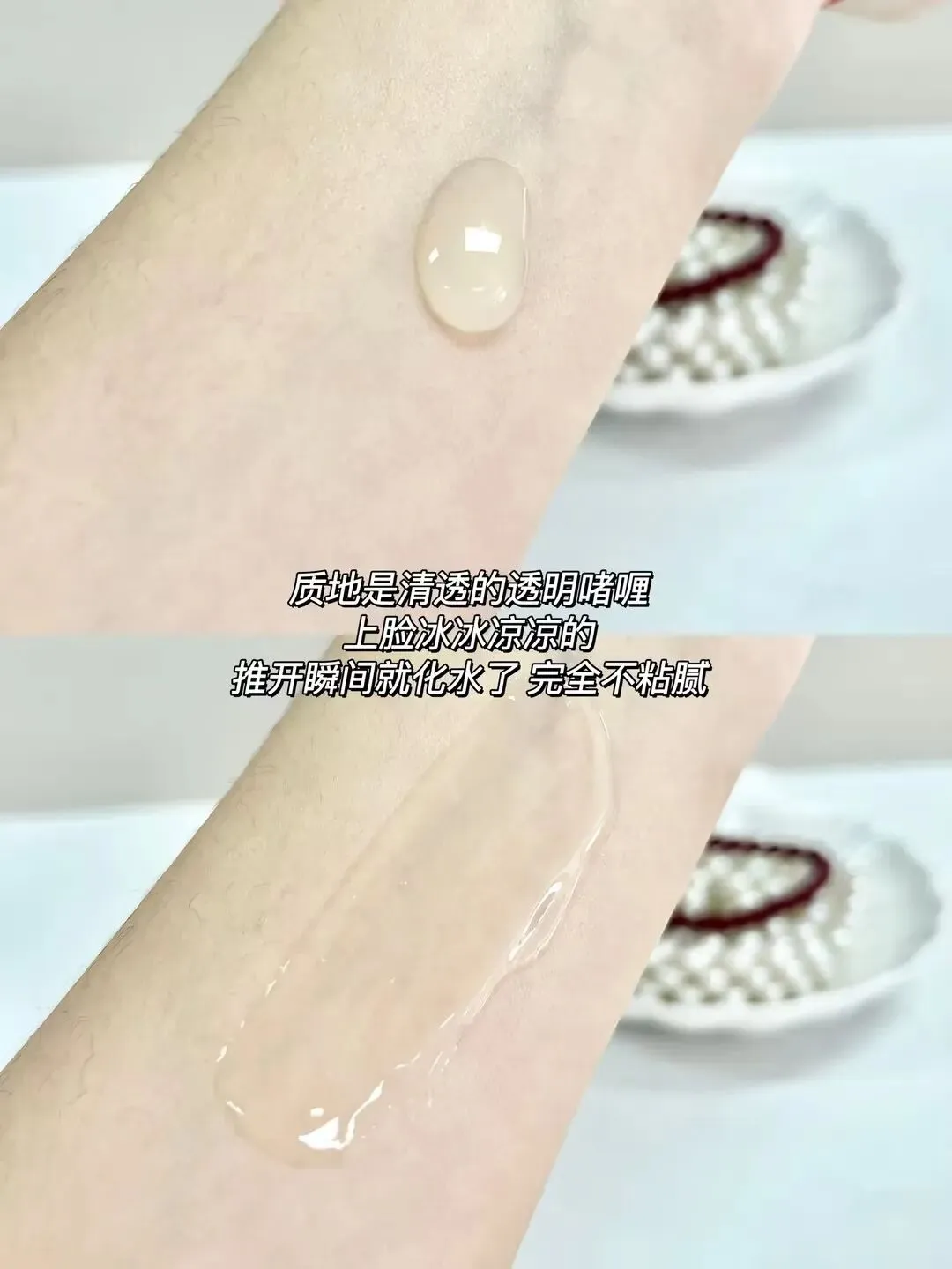 清透啫喱质地,20 秒快速吸收,不粘腻、不搓泥、不闷痘,干后无白屑,后续叠加防晒、底妆无压力。