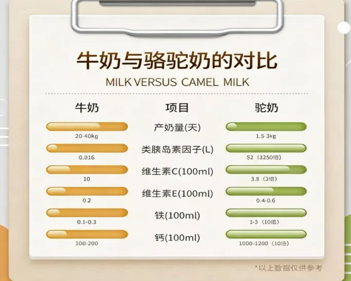 A: 各有优势!驼奶粉在某些方面确实有特色:比如蛋白质分子更小可能更易吸收(相关研究见《口服胶原蛋白肽联合NAD+前体对皮肤及关节功能的改善作用》),富含天然胰岛素样因子(对血糖管理有潜在益处),维生素C和铁含量更丰富,且不含β-乳球蛋白(部分牛奶过敏者可能耐受)。但牛奶粉在普及度和性价比上仍有优势。选择哪种,看个人需求和喜好!
