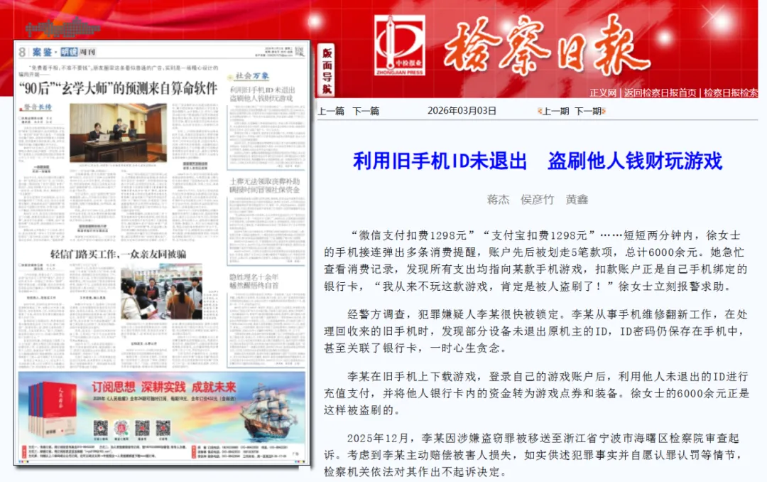 李某在旧手机上下载游戏,登录自己的游戏账户后,利用他人未退出的ID进行充值支付,并将他人银行卡内的资金转为游戏点券和装备。徐女士的6000余元正是这样被盗刷的。