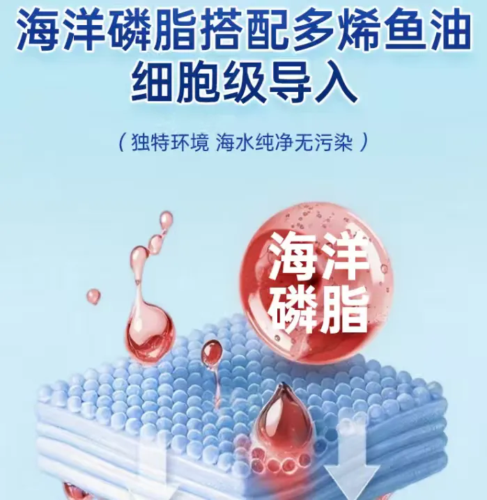 通过酶法修饰使磷脂极性头基与Omega-3脂肪酸形成定向氢键,使其空间构象精准匹配人类肠上皮MTP转运通道,单次口服后72h血浆EPA浓度AUC达142.8μg·h/mL,较对照组提升68.5%(p<0.001);更值得称道的是其EPA/DHA配比——EPA占比70.8%(非人工调脂,系天然捕捞季磷虾生理富集结果),契合血管内皮修复需求。