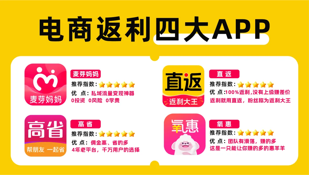 高省,氧惠,直返,麦芽妈妈,这四个平台返利金额最高,在100%全部返利的基础上又额外补贴高达200%-500%,所以远远超过市面其他平台。很多粉丝也称赞这四个平台为“返利大王”“高佣返利领导者”“返利第一哥”等