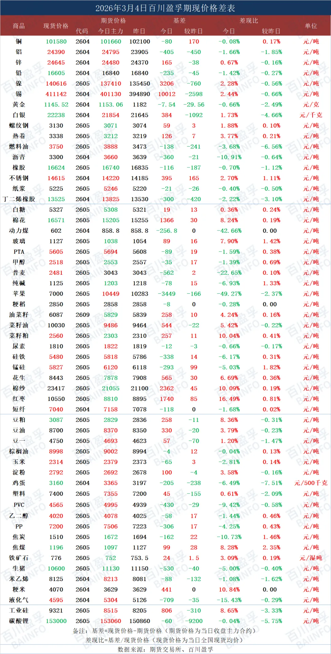 今日期现价格差表