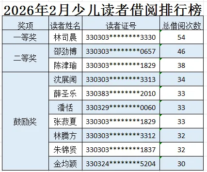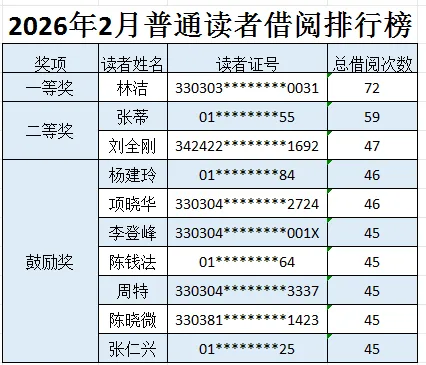 以上数据是通过Interlib图书系统统计,请获奖读者携带社保卡或读者证,于近日到龙湾区图书馆二楼图书借阅区领取精美奖品一份。