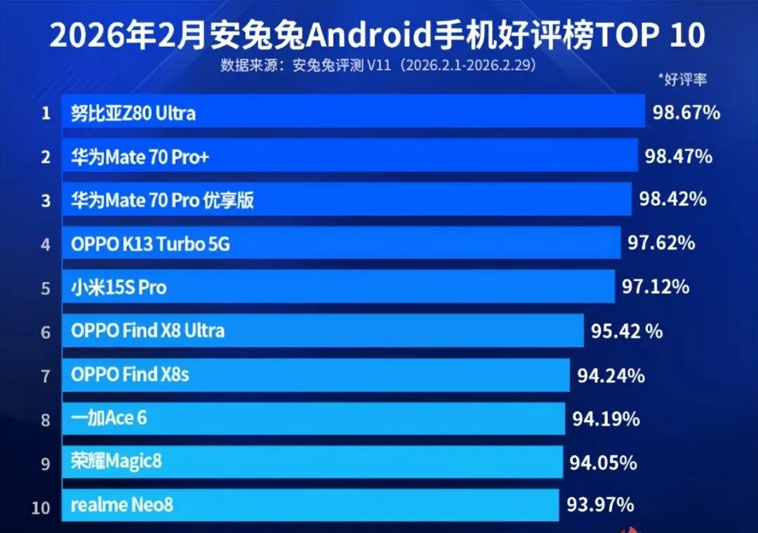在手机行业卷到极致的2026年,很多人买手机时都会看一个指标——好评率。它不像跑分那样冷冰冰,也不像参数那样容易“堆料”,而是来自真实用户长期使用后的反馈。最近一份手机好评榜公布,其中不少机型的评价率都超过97%,这意味着用户整体满意度非常高。
