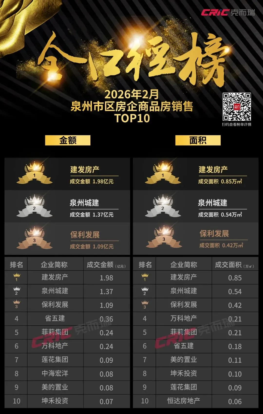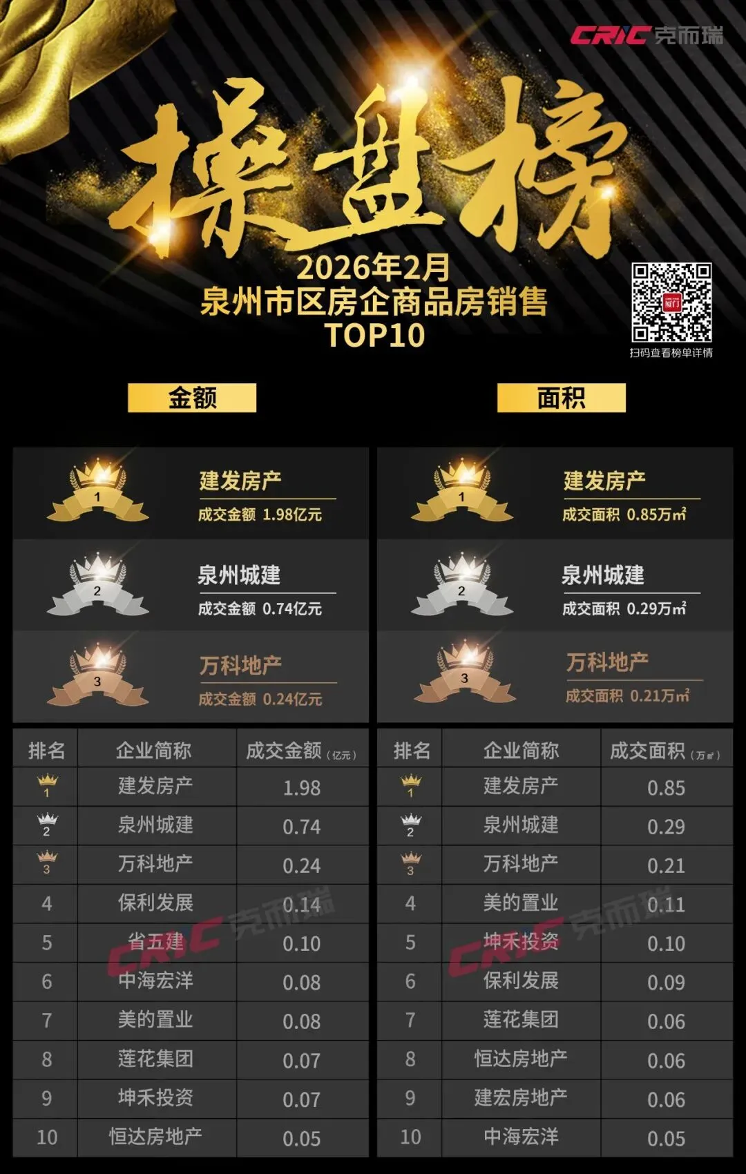 从上榜企业上看,2月泉州楼市持续保持“双雄鼎立”现象:建发房产、泉州城建包揽三榜TOP1、TOP2,两者操盘金额市场份额合计占比超七成,成为稳定市场的压舱石。
