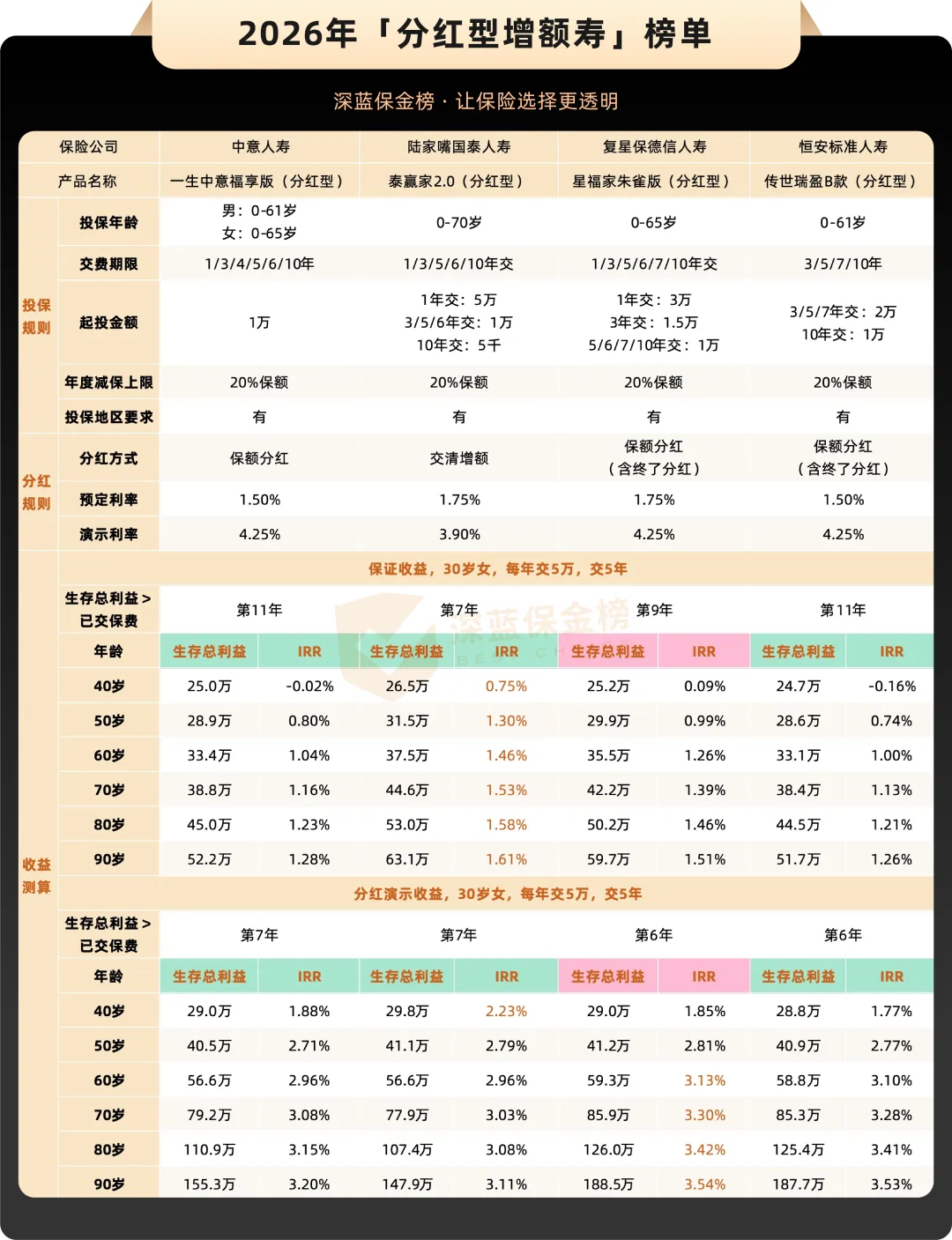 下面来看看分红型增额寿榜单,共有4款产品: