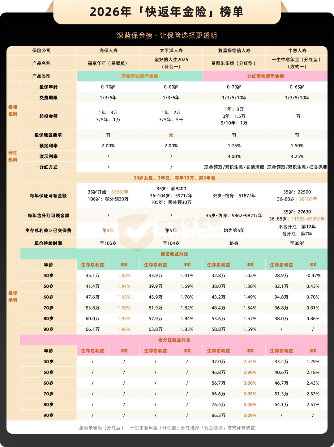 本期快返型年金险榜单有2款固收型,2款分红型,具体如下表: