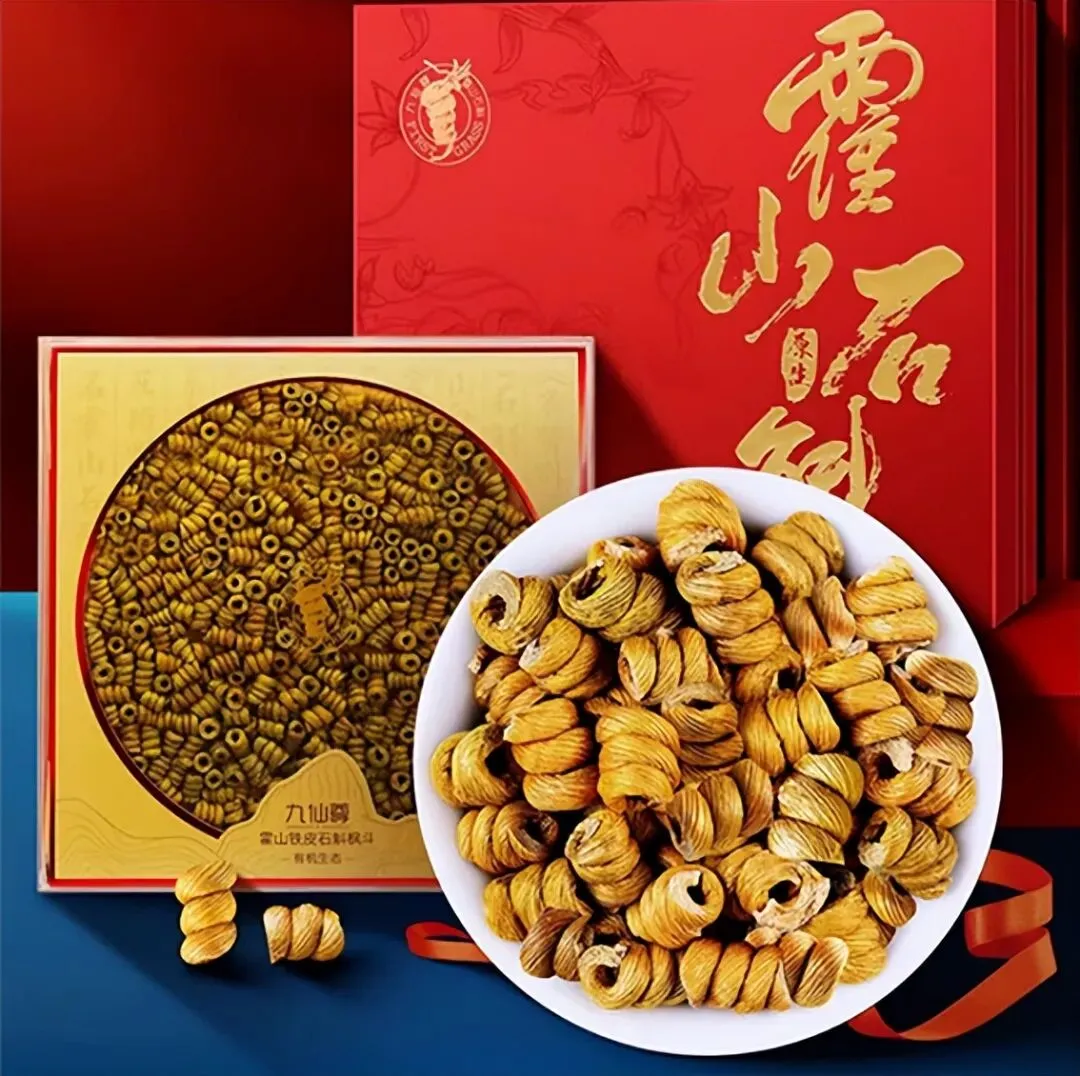 源自“中国石斛之乡”霍山县核心产区,仿野生自然生长模式。礼盒搭配陶瓷小罐,防潮、防氧化、防挤压。石斛颗粒色泽金黄,三节一粒,纹理分明,中心有标志性圆孔,胶质浓郁嚼食粘牙,煮水清亮,拒绝染色。包装用心,送礼和养生兼顾。