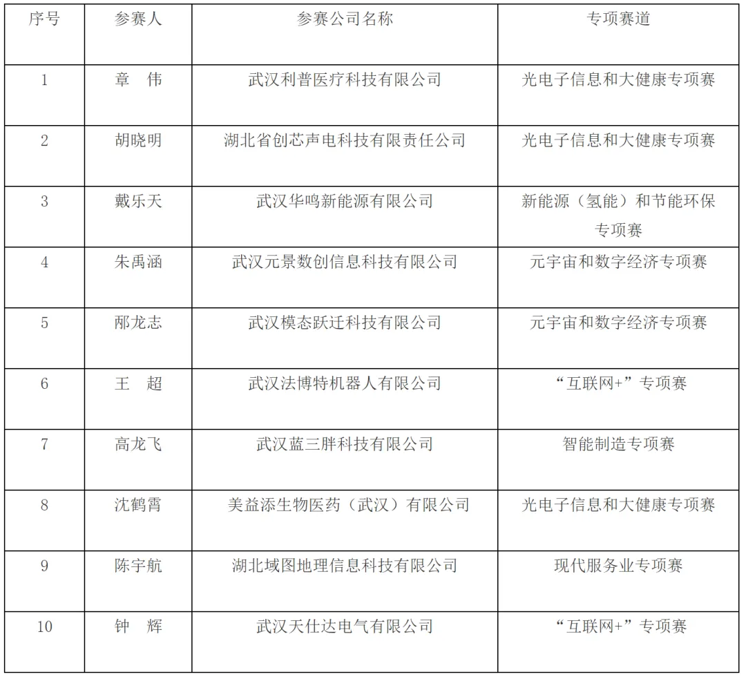 大赛围绕服务武汉市“965”产业集群发展及产业特点,分别设立智能制造、“互联网+”、新能源 (氢能)和节能环保、光电子信息和大健康、文化创意、元宇宙和数字经济、现代服务业、现代农业8个专项赛道。