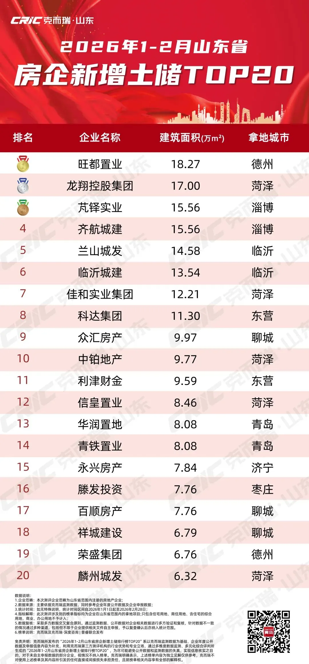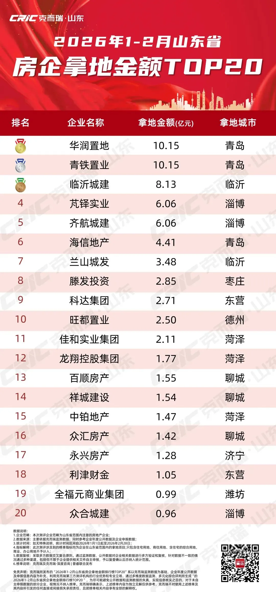 本次克而瑞发布的2026年1-2月山东房企拿地排行榜,用数据来呈现房企的市场表现: