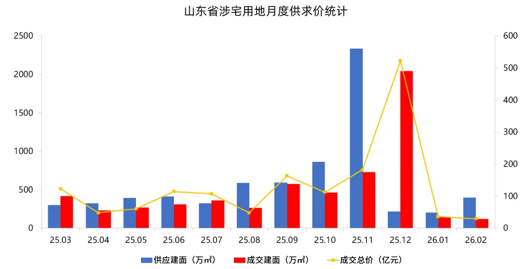 1-2月,山东共出让涉宅用地55宗,建筑面积约261.33万m²,成交总价约65.53亿元,成交规模及总价均处低位。