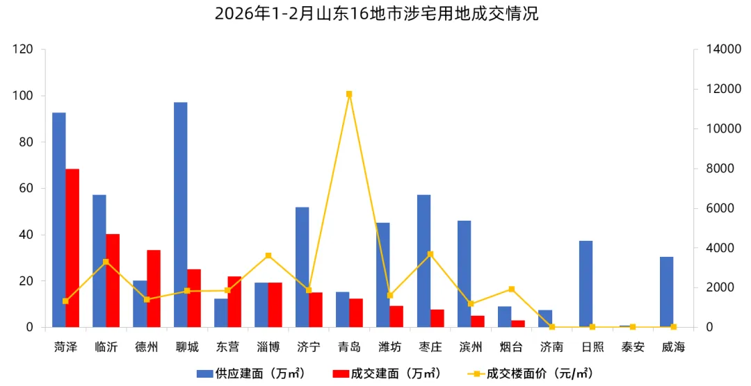 济南、日照、泰安、威海等城市,1-2 月无宅地成交。