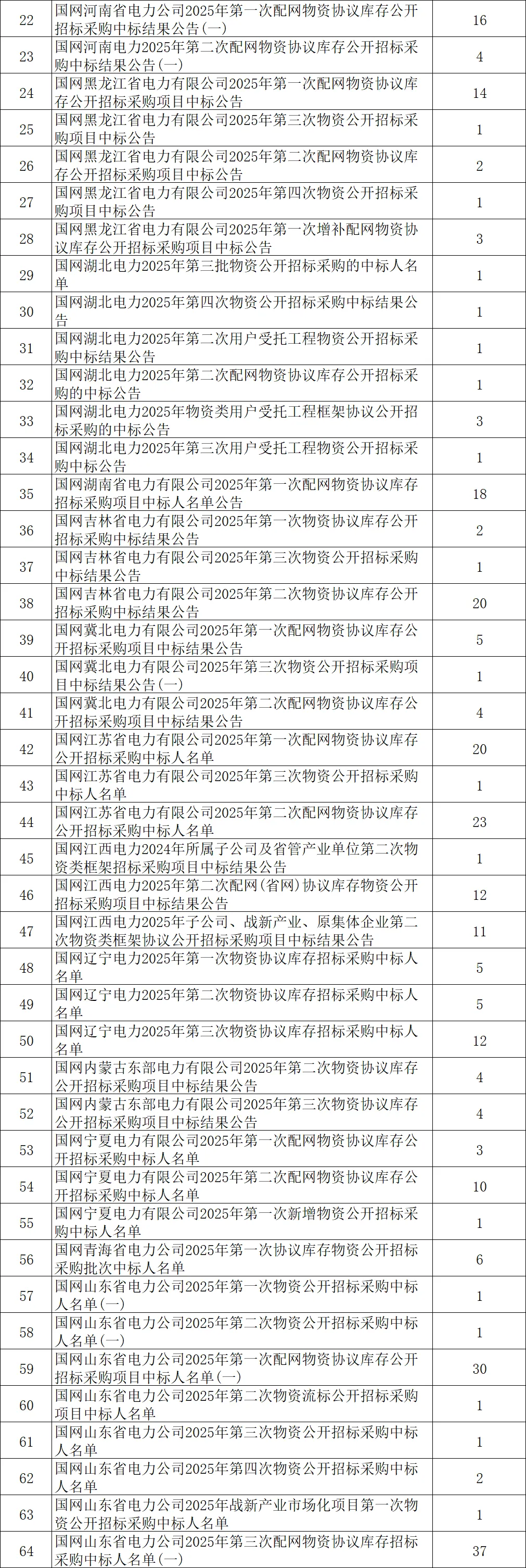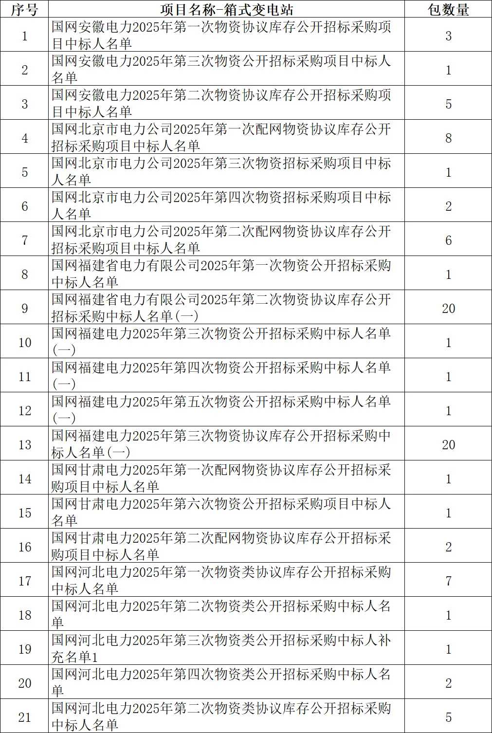 本期内容,小编整理了国网省公司2025年度箱式变电站产品的中标情况,为投标人选择2026年合作对象提供参考!2025年,国网27个省电力公司都有发布箱式变电站产品的中标结果,分别如下:2025年,国网山东公司箱变招标数量最多,共有74个包,其次是江苏和福建,都是44个包本期内容,小编整理了上述项目箱式变电站的中标名单:箱式变电站中标企业有111家,累计中标金额近59.78亿元。其中18家企业中标金额超过1亿元,5家企业中标金额超过2亿元,1家企业中标金额超过3亿元。1、数据来源国家电网电子商务平台公示的中标结果信息;2、此榜单仅反映企业在国网中标的能力,并非企业实际排名;备注:来源国家电网电子商务平台,转载中标之家公众号;【声明】信息以官方发布的为准。本文仅做信息分享,如有侵权请告知删除。