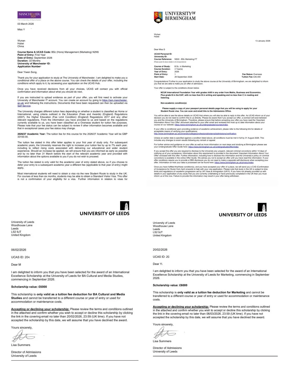 首届即优质,质量筑口碑。项目学子凭借NCUK课程成绩免雅思成绩直通海外名校,以优异学术表现获合作院校高度认可。其中,宋同学、李同学等学子凭借突出成绩荣获英国利兹大学6000英镑奖学金;宋同学获得英国利物浦大学7500英镑奖学金,实现首届招生即达优质培养标准。