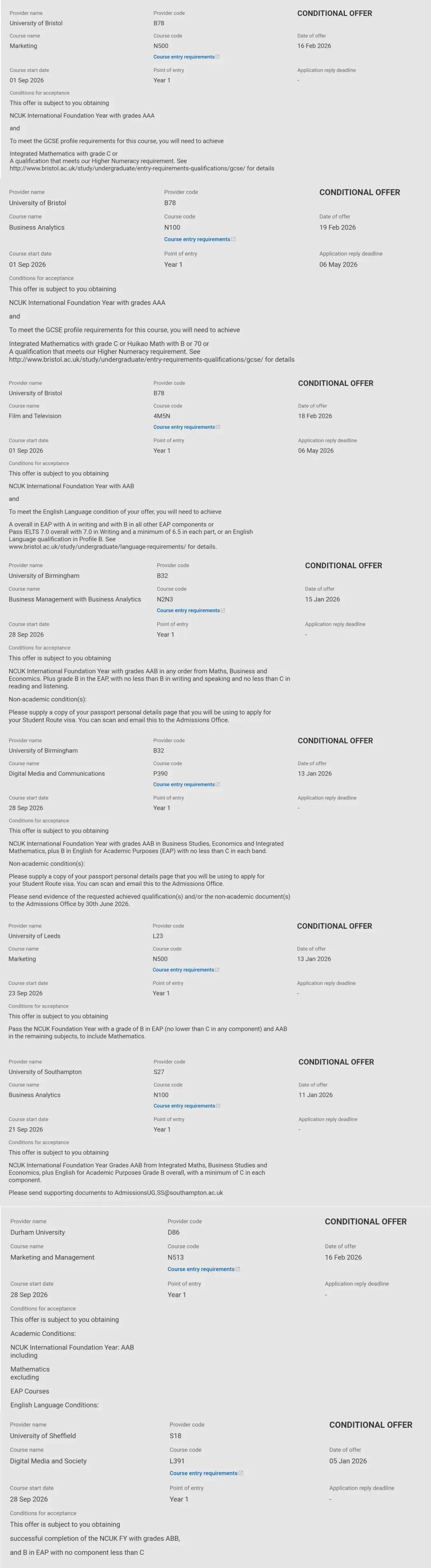 近日,我院NCUK国际本科项目首届学子升学成果揭晓。截至目前,人均5份海外名校录取通知书,录取院校涵盖英国曼彻斯特大学(QS世界排名35)、布里斯托大学(QS世界排名51)、伯明翰大学(QS世界排名76)、利兹大学(QS世界排名86)、南安普顿大学(QS世界排名87)等全球百强学府,澳大利亚、新西兰等方向录取结果也将陆续发布。