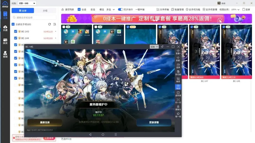 5. 桃七云手机:界面美观,操作简便,对新手友好。多开管理功能清晰,支持批量操作。经常推出性价比极高的限时套餐和联合活动,适合精打细算的玩家。
