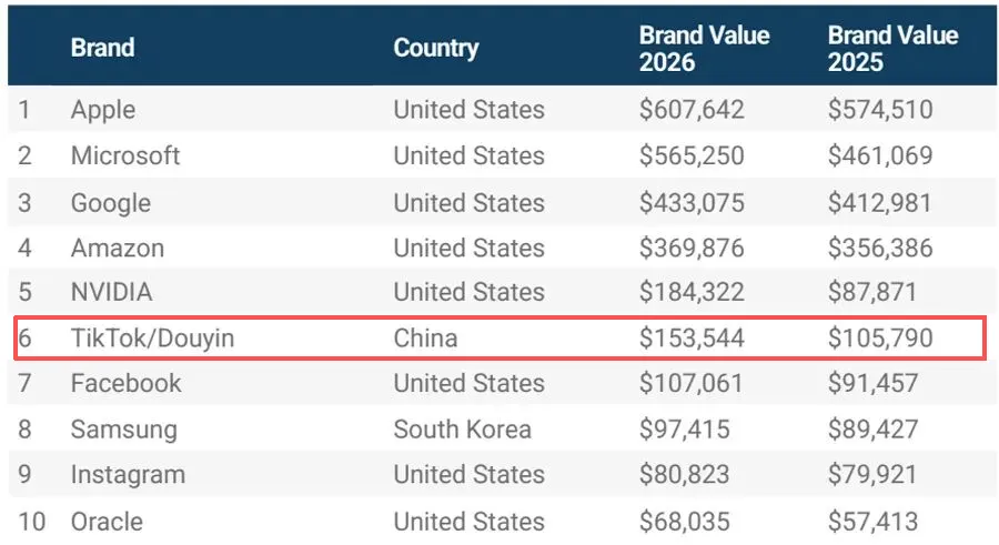 :苹果(6076 亿美元)品牌价值约为抖音的 4 倍。这种差距源于商业模式不同:苹果构建