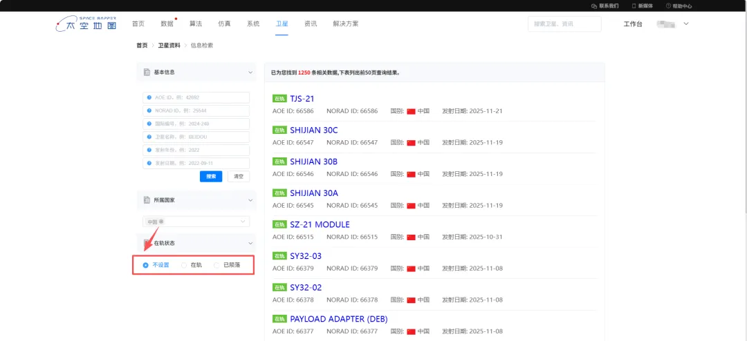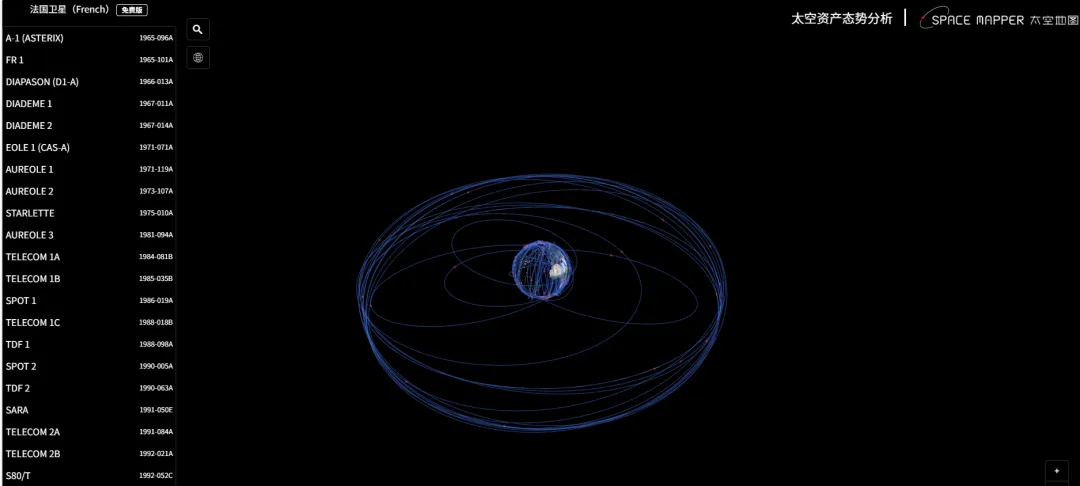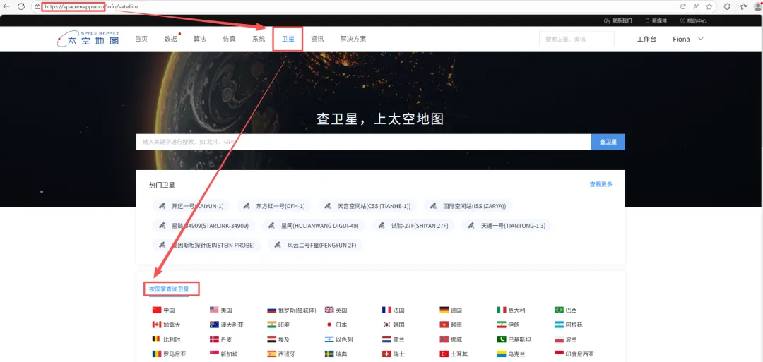 在浏览器输入太空地图网址(https://spacemapper.cn),选择顶部导航栏中的“卫星”,向下滑动至“按国家选择卫星”: