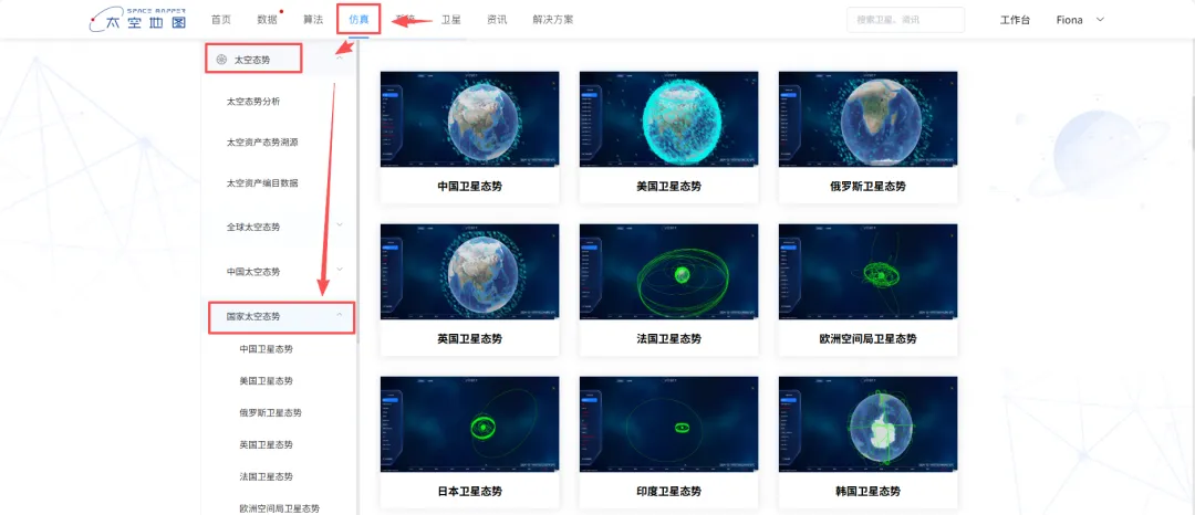选择顶部导航栏中的“仿真”,向下滑动至“国家太空态势”。