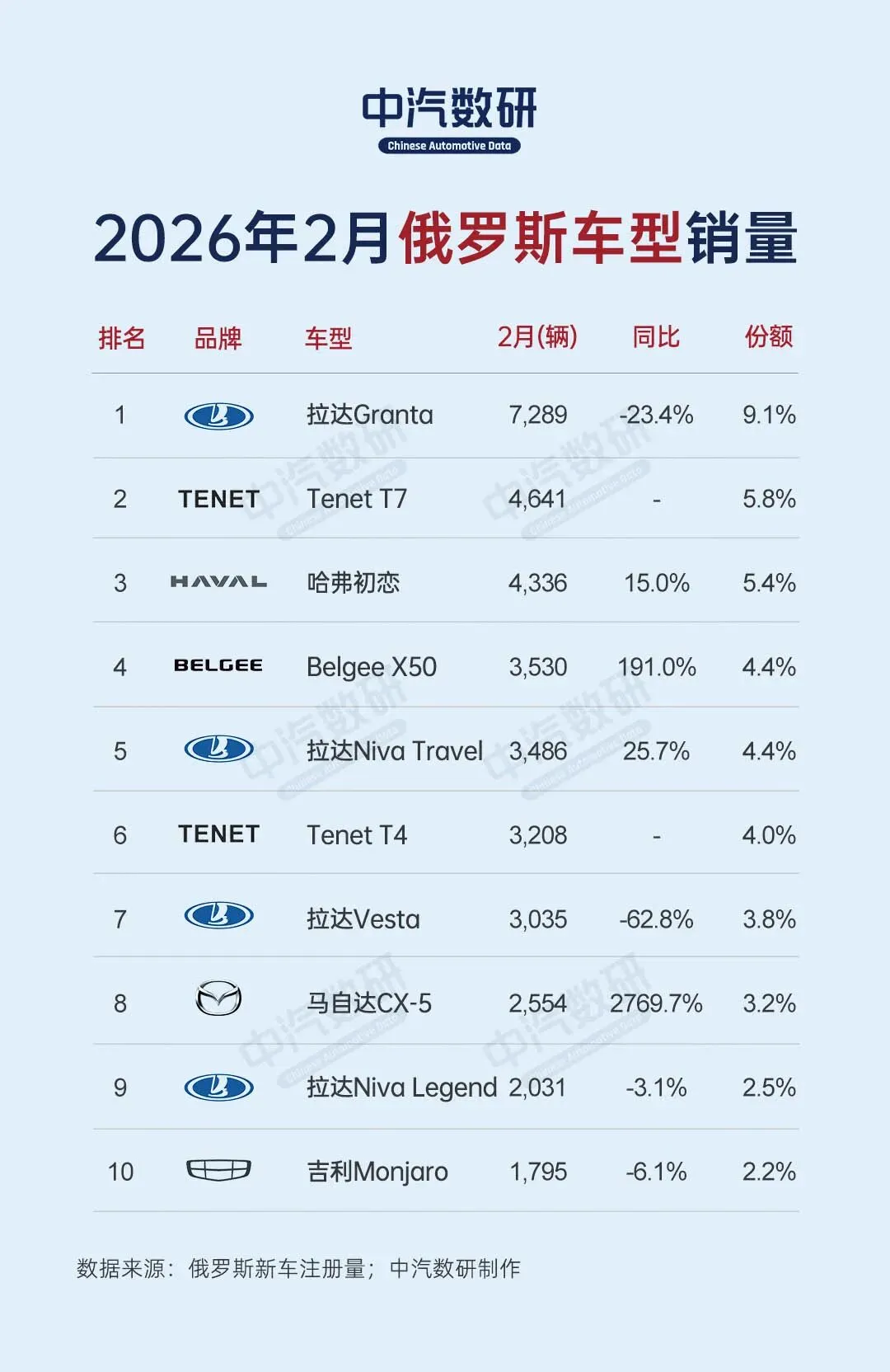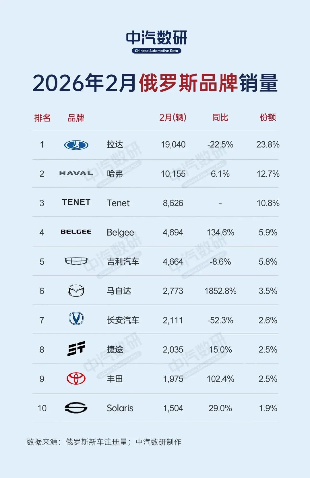 Autostat机构发布的数据显示,2026年2月俄罗斯新乘用车销量为80,027辆,同比增长2.5%。