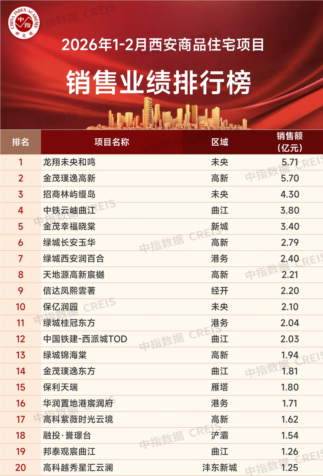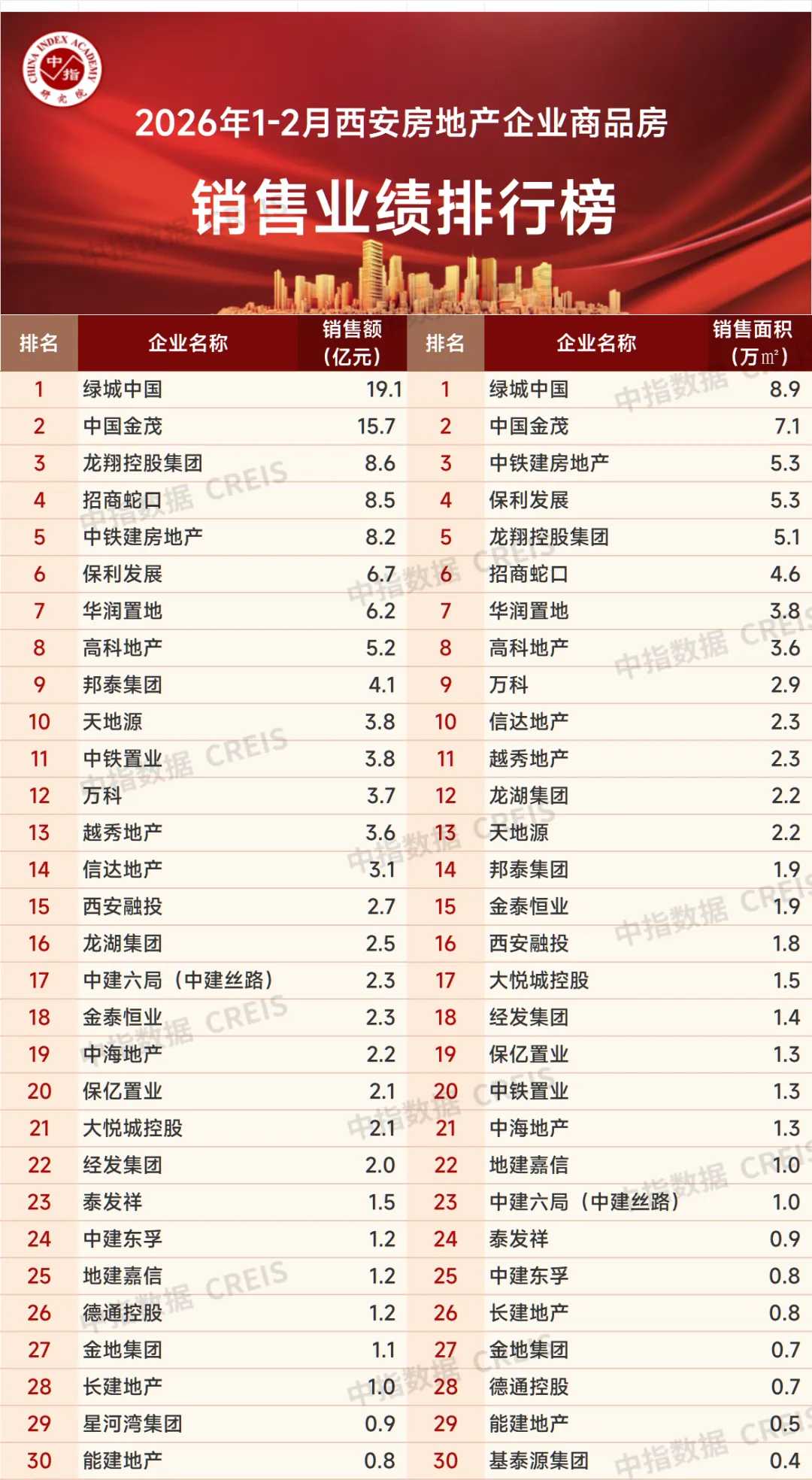 中指研究院最新发布2026年1-2月西安房地产企业及商品住宅项目销售业绩排行榜,房企格局重塑、单盘竞争白热化,本土房企与民企表现亮眼,快来看看开年楼市的核心看点!