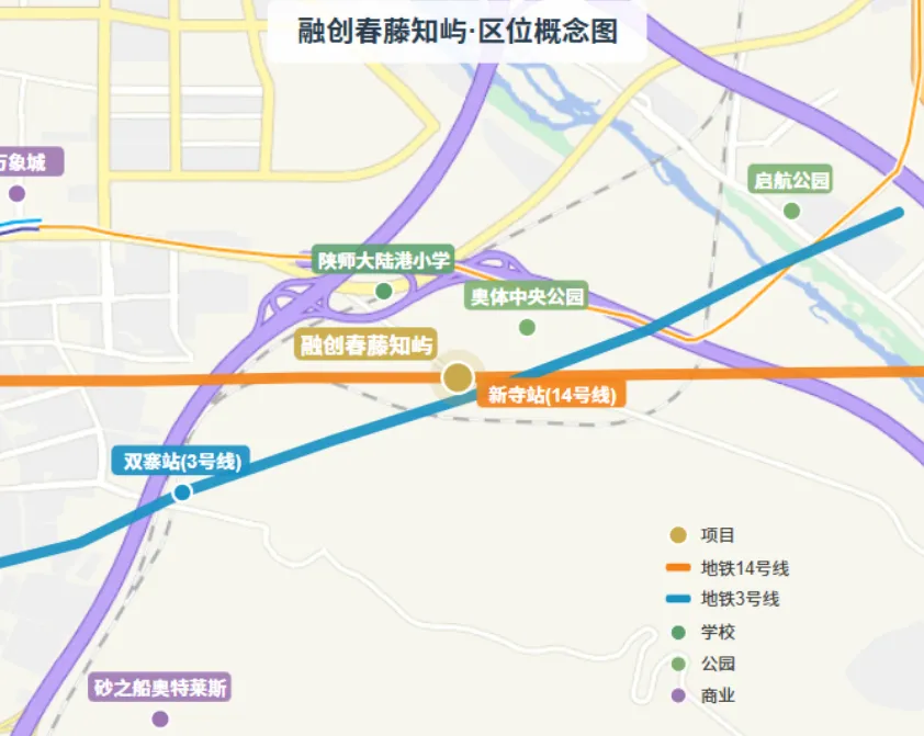 港务区奥体板块的融创春藤知屿(备案名:四季云想),该地块为融创2023年8月摘得,位于欧亚大道以东、在奥体中央公园沿线,南侧紧邻地铁14号线新寺站,向西1.5公里是预计今年开业的华润置地万象汇,向南400多米为陕师大陆港小学,生活配套丰富。