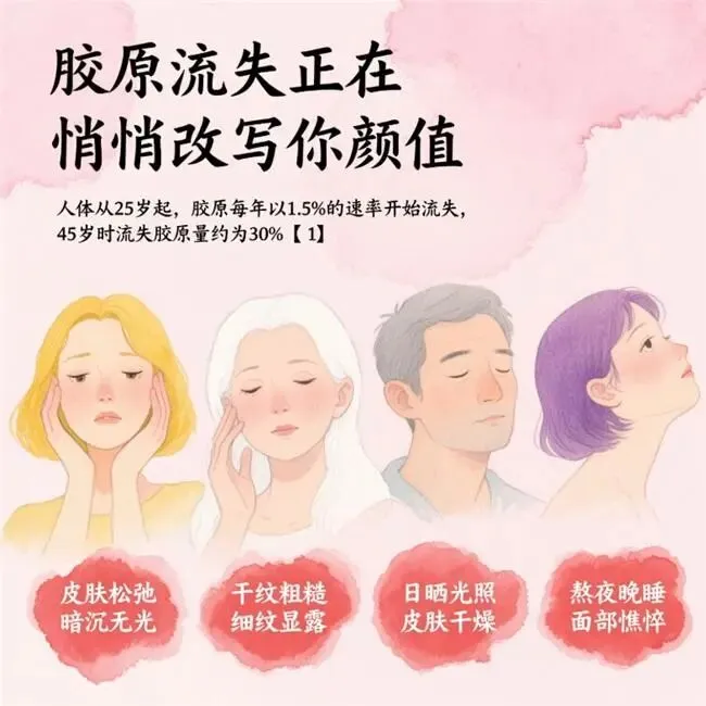 胶原蛋白是支撑肌肤结构与轮廓的关键蛋白质,随着年龄增长,皮肤逐渐失去原有的饱满度与弹力。青春期后,新陈代谢由高峰逐步归于平稳,25岁前后胶原含量开始下降,30岁起逐步加快流失,法令纹和干纹悄然浮现,松弛、暗沉、凹陷等同步加剧。表层干燥与底层损伤相互作用,肤质由细腻转为粗糙,轮廓失衡引发早期疲态,让肌肤呈现出岁月痕迹。