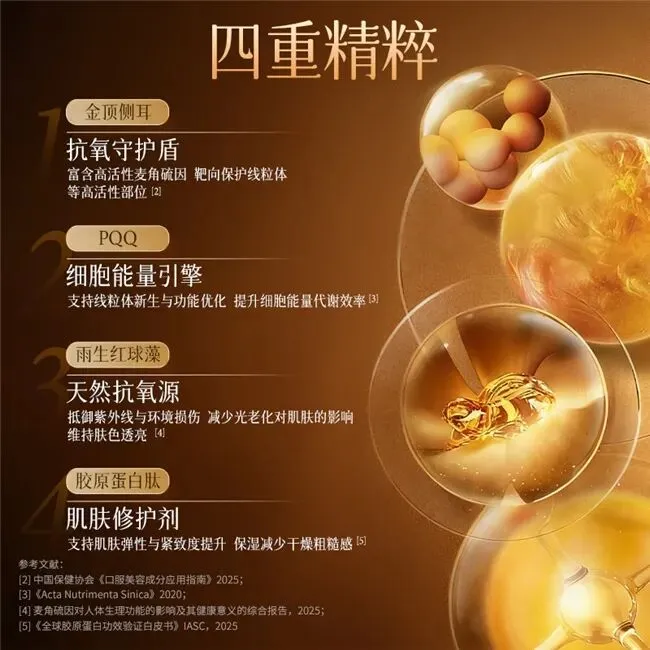 产品以“四重精粹”逻辑构建整体结构。金顶侧耳作为抗氧守护核心,重点保护细胞线粒体;PQQ承担细胞能量驱动角色,支持修护与新生效率;雨生红球藻提供天然抗氧支持,减少环境与光损伤,帮助维持肤色明亮;胶原蛋白肽作为修护基础,兼顾弹性维持与保湿改善。整体配方强调多维协同养护,不追求单点功效,而是通过系统补给满足阶段性补养与多场景使用需求。