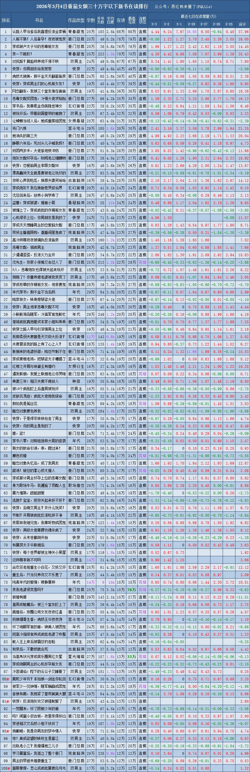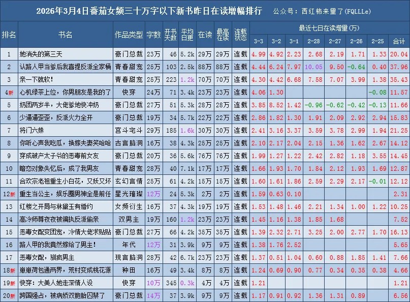 番茄新书榜范围:30万字以下、已签约未下架、已经开始推荐的且未断更,完结未超过90天的番茄原创作品