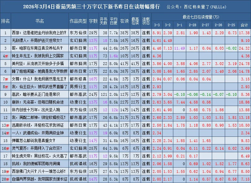 番茄原创新书榜中的在读数据