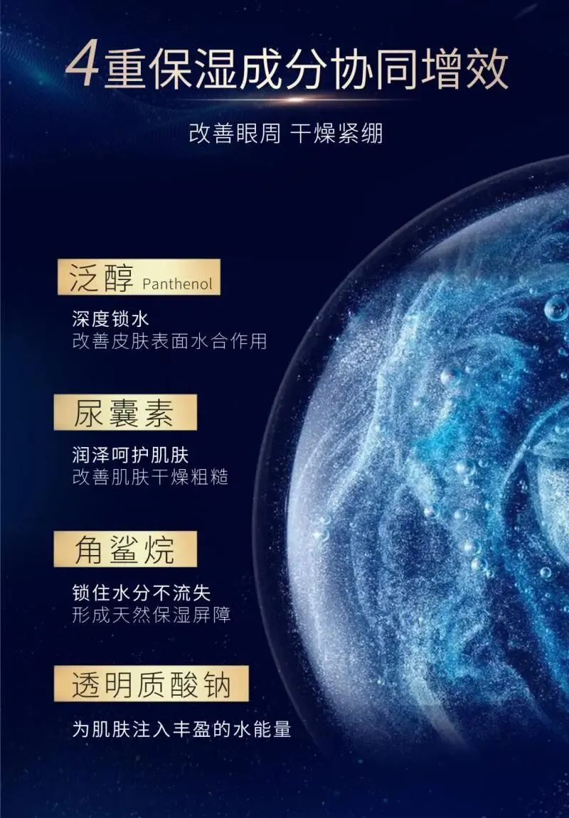 透明质酸钠+二裂酵母发酵产物溶胞产物+龙胆(GENTIANASCABRA)根提取物,可以实现深层修护屏障,搭配透明质酸钠补水保湿,让眼周越养越紧致平滑,且有弹性