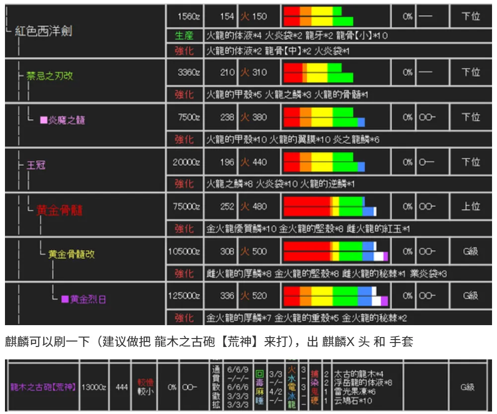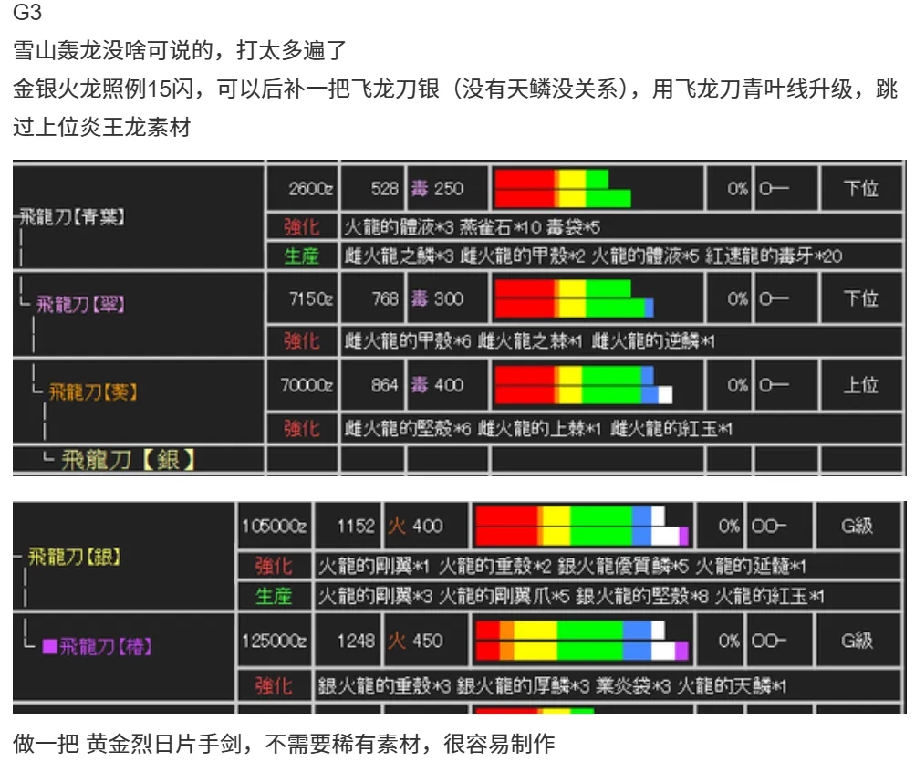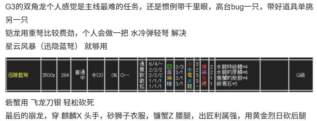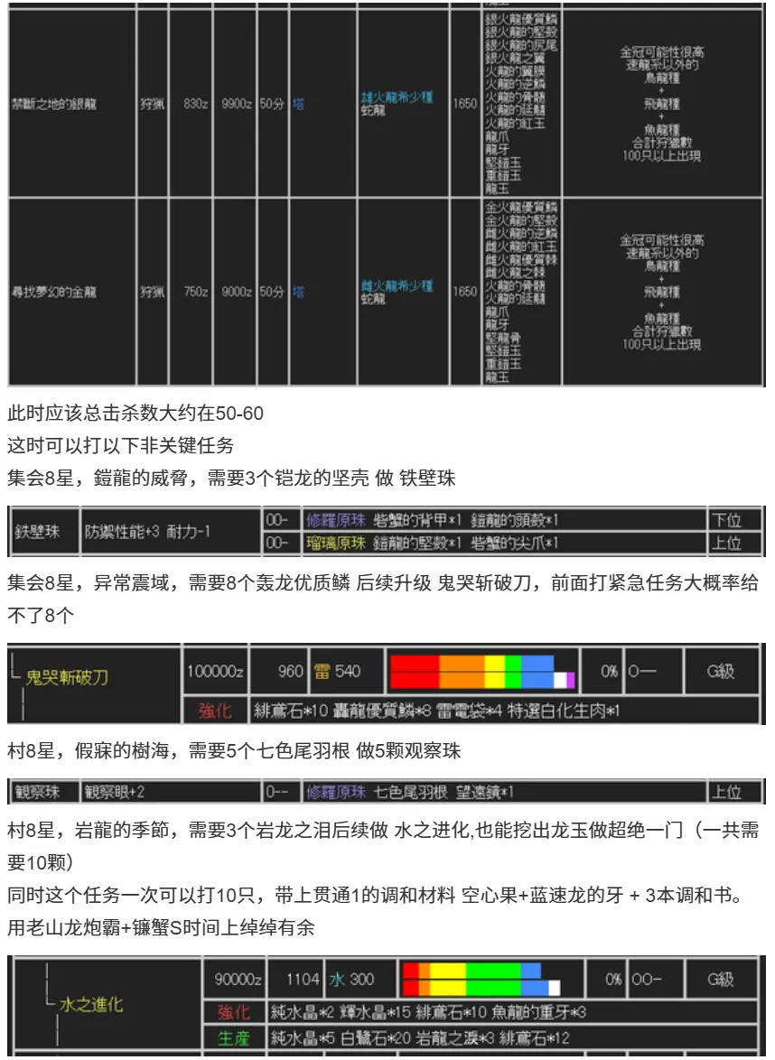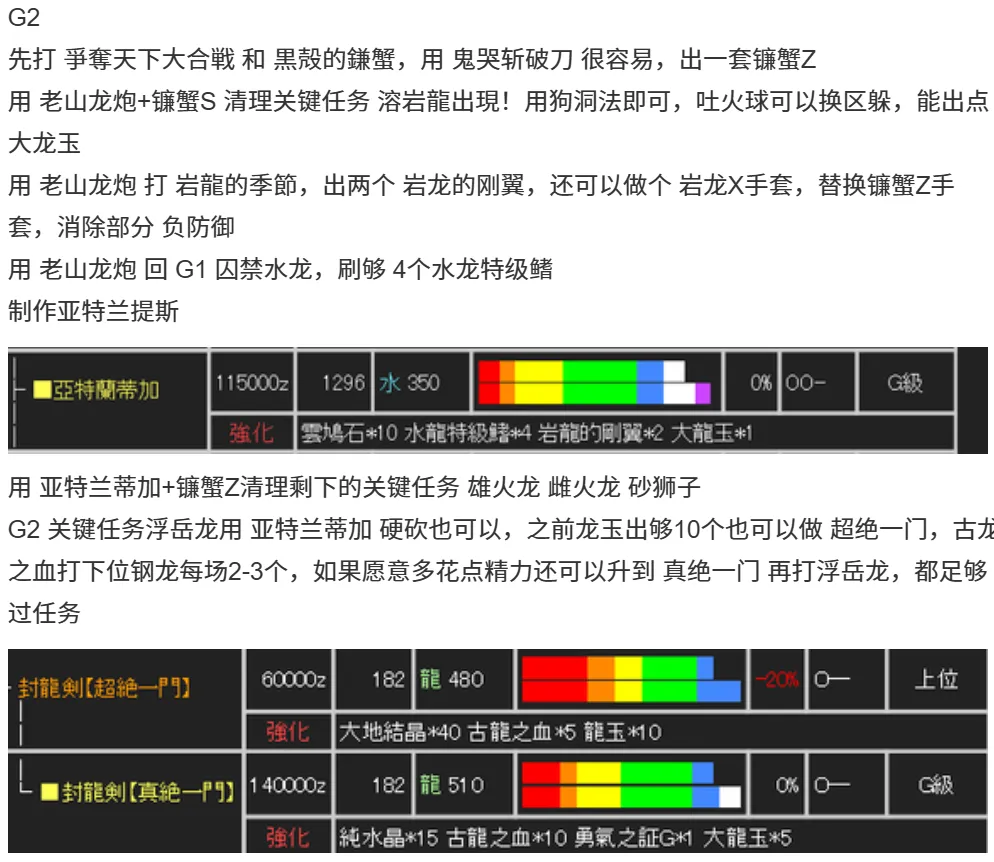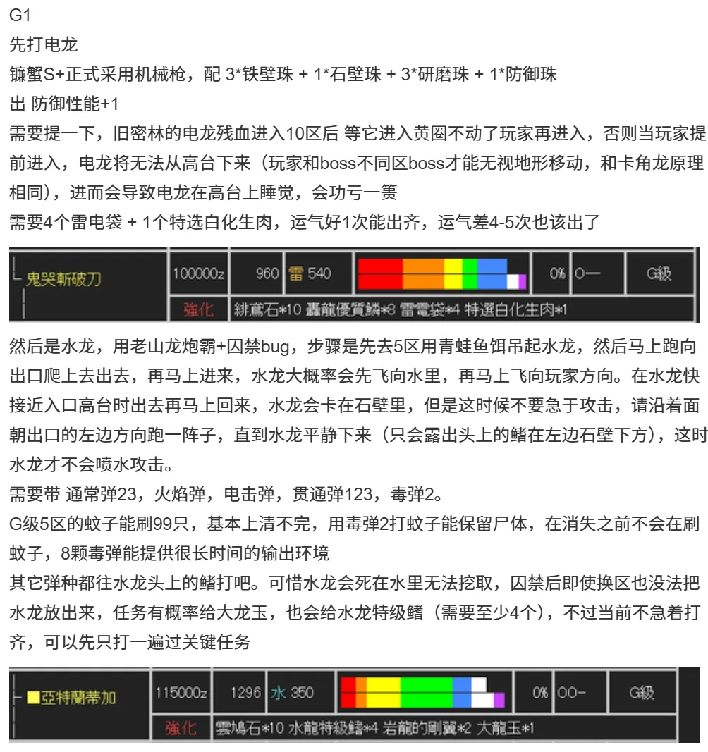 2G的武器和防具制作耗时长,所以尽可能少做非必要装备能极大减小开荒时间2G的很多boss被特定武器克制,同时克制特定武器,尽可能用克boss的武器才能玩的舒服,因此单武器一筋注定吃瘪开局选择老手,能跳过进入训练场的环节如果有特典商人,首次进入游戏行脚商必定卖特典道具,可以先买一颗怪力之种如果没有也不要紧,行脚商的4种随机情况有一种也卖怪力之种,每次任务后看1眼即可村1星,买铁镐挖2区和3区的两个矿点概率出燕雀石,其中2区需要从顶部朝下小跳两层才可到达,请注意观察。4区矿点能出一些铁矿石 圆盘石可以先用村1星的 采集雪山草 收集矿石然后做 钢铁枪,需要铁枪升级两次它的下一级圣骑士枪因为需要 大地结晶 和 燕雀石,当前不一定够有了 钢铁枪 就可以轻松打过村1星村2星,先做沙漠素材采集如果之前没买到怪力之种,可以在1,2,6区获得另外,4区和10区可以采集大量怪物/飞龙粪便,为后续种植怪力之种做准备前面采集雪山草,挖矿(黄金之碎片)应该攒了不少农场点数,优先升级 田+2开始种植 怪力之种 (一个能卖140,前期来钱的高效手段)后面懒得刷粪便了,可以从行脚商半价买大量 蚯蚓鱼饵 来当肥料种植几轮后应该有不少钱,从武器店猫处买下战斗套装(每件1500,一共7500)并升级 圣骑士长枪,只需要4个燕雀石+5个大地结晶,很容易得到做村2星关键任务 豬突猛進!大野豬王用得到的 大猪之皮 做 体力珠,2个就能配合 战斗套 发动体力+20做村2星关键任务 密林的大怪鳥(建议每次都破头,得到的怪鸟之耳后续做 千里珠 要用)只做怪鸟护腕即可 (头和脚一共要4个怪鸟之耳,托节奏所以不要)怪鸟护腕替换战斗套手套,插3个体力珠能发动体力+30然后清理村2星长枪打桃毛兽王可以多用冲锋长枪打电龙很容易,防住全身放电反手攻击(全身放电只对同一目标判定一次)村3星先做沼地素材采集,把矿点都挖了,找一找光水晶第一次获得 灰水晶原石 时2区怪物会被替换成 黄速龙所以第一次搬运建议 3-2-4-5-营地,事先清理4,5后续先清掉2区(需要反复清几遍),然后走3-2-1-营地此时优先做铁刀,圣骑士枪不急于升级,从巨剑升级铁刀比较划算,至少升级到 铁刀神乐(有斩破刀更好,没有可以下一星再升)打毒怪鸟请用铁刀,用长枪过于坐牢盾蟹用太刀和长枪都很简单3星紧急雪狮子王同样用太刀和长枪都不难,长枪多用冲锋,吐冰可防御到了村4星先去火山采集素材, 但不是做 火山素材 采集,而是 掃蕩鐮蟹群6区和8区各有一个能出 红莲石 的挖掘点,需要2颗之所以选 掃蕩鐮蟹群 任务,因为 搬运火药岩(每颗3000农场点,能很容易升满农场) 不会造成途径区域替换小怪,所以可以事先清理 5区和4区按6-5-4营地的路线搬运其中火药岩在上图6区2号位置村4星需要做出加特林矛,前面挖矿就能得到 红莲石 和 辉龙石,炸药用 硝化蘑菇+火药草 合成,之前如果开了蘑菇树+一直种怪力之种 应该不缺,如果没有请从行脚商购买斩破刀,如果电气袋不够请回去打电龙,用加特林矛非常简单,捕获给电气袋概率高龙虾小壳打 討伐20只小龍蝦…!?每次随机给1-2个。水龙之鳞请回去打3星水龙,用长枪能防住铁山靠,打回合制即可用斩魄刀杀 一角龙 和 镰蟹用阿曼尼弩带水冷弹 + 贯通弹 杀岩龙紧急任务 轰龙 用长枪+抢走其实容错很高,不至于拿太刀被一套连死,当然太刀带陷阱闪光也很简单村5星先打麒麟,用阿曼尼弩+散弹,防具请做一套 红速龙头 + 怪鸟衣服 + 红速龙手 + 怪鸟腰 + 白速龙腿发动 体力+30,散弹强化1.3倍此时商店不卖,散弹3,如果合成素材多,请装消音器降1点反动,否则打散弹3会有硬直。否则就只带散弹1,2带睡眠弹,配合 2个支给大桶爆弹 可以眠爆一次 600伤害(150*3+150)大约打5-8次能得到两个 麒麟的雷尾,升级 鬼斩破其余材料做一套麒麟套(同时需要电气带和毒怪鸟的皮,如果缺可以回去打几轮)麒麟套防很高,装4个千里珠(前面破大怪鸟耳朵的奖励)+1个持续珠(需要翠水龙素材+飞虫素材)飞虫素材可以做 村2星 巨大昆虫出現!麒麟套的属性攻击强化对于鬼斩破大约是攻击up中的效果关键任务 双毒怪鸟,角龙,双盾蟹 都用 鬼斩破 解决铠龙用 阿曼尼弩 + 水冷弹 解决5星关键用鬼斩破,请带好调和书1234 + 5闪光玉 + 10素材玉+10光虫,用背向扔的技巧能极快速度解决村6星,不需要做装备全部对手都用 鬼斩破 解决火龙仍然建议15闪其中的 4本角 可以先用 角龙卡高台bug 解决1只,需要前面发动的 千里眼15自动标识具体步骤是,不带猫,带闪光玉去沙漠9区高台,等角龙来,角龙撞向高台会卡角,此时马上冲到8区,等角龙状态变蓝(脱战)变蓝后马上进入9区,此时角龙会钻地准备换区,马上扔一颗闪光另它发现你,打断它换区,同时立刻回8区小地图上看到角龙向前移动一点距离(怪与猎人不同区时,怪可无视地形移动),再马上回9区。角龙就站在高台上了等一段时间,角龙换区时间到了,它因为卡在高台无法换区,只能一直朝前走,这时爬上高台砍腿,会被蹭血村6星紧急任务砦蟹,此时没有耐震,要注意不要跟腿太紧,会被震晕,太刀砍腿,倒地翻到壳和身体交接处向壳方向气刃斩砍弱点,时间内杀掉砦蟹还是很容易村7星没有素材采集任务,討伐暗夜的大野豬 是相对最适合搜集素材的任务(也可以顺便搬运白水晶原石,2500一颗)需要做出 加特林矛改,如果之前没有凑齐两个 火龙的骨髓,请回去打村6星一堆巨影用加特林矛改 杀村7星电龙+