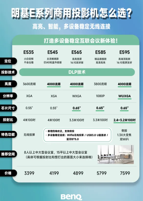 在明基丰富的商用产品线中,智能商务E系列是面向现代会议场景的核心主力。该系列全系亮度近4000流明,采用DLP技术确保画质稳定,并内置专为会议优化的智能系统,支持无线投屏、U盘直读等高频功能。从入门级的E535到旗舰级的E595,E系列完整覆盖了从10㎡小型洽谈室到50㎡中型会议室的主流商用场景。