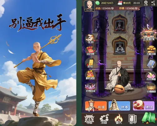 简直是当代年轻人的佛系解压神器。不用肝不用氪,挂机就能攒功德,点点屏幕敲木鱼,就能从普通小和尚一路逆袭成机甲佛祖,玩法轻松又魔性,上班摸鱼点两下,烦恼全没了。