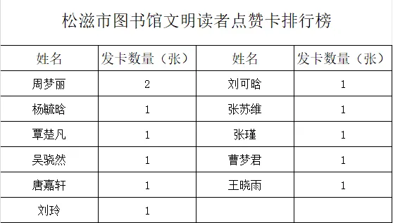 为培养读者良好的阅读习惯,营造文明和谐的阅读环境,提升图书馆的读者满意度,促使更多读者爱上图书馆、爱上阅读,掀起全民阅读的新高潮,松滋市图书馆在全馆范围内开展评选“文明读者”活动,并于每月底公布当月获得“文明读者”点赞卡排行榜。