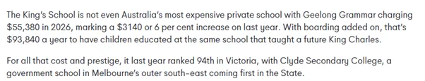 The King‘s School去年在新州排名第42位,尽管每位12年级学生还获得了$7678的政府补贴。而Geelong Grammar去年在维多利亚州仅排名第94位,而位于墨尔本外东南区的公立学校Clyde Secondary College则名列该州第一。
